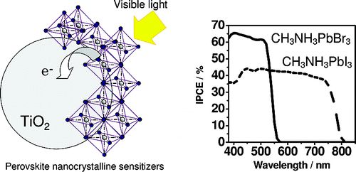 本文首次发现两种有机卤化物钙钛矿纳米晶体CH3NH3PbBr3和CH3NH3PbI3可以有效地敏化TiO2用于光电化学电池中的可见光转换。附着在介孔TiO2薄膜上的钙钛矿纳米晶体表现出强带隙吸收。基于CH3NH3PbI3的光伏电池实现800nm的光谱响应,太阳能转换效率为3.8%,而基于CH3NH3PbBr3的电池则显示出0.96 V的高Voc,EQE为65%。