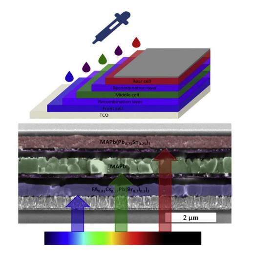 本文展示了使用高挥发性乙腈/甲胺(ACN / MA)溶剂型钙钛矿溶液来实现完全溶液加工吸光剂、传输层和复合层以用于单基板全钙钛矿串联和三结太阳能电池。结合FA0.83Cs0.17Pb(Br0.7I0.3)3(1.94 eV)和MAPbI3(1.57 eV)的双端子串联器件达到了超过15%的稳态PCE。另外,实验表明MAPb0.75Sn0.25I3(1.34 eV)窄带隙钙钛矿也可以通过ACN / MA溶剂系统进行加工,这是第一个概念型验证,使单基板全钙钛矿三结太阳能电池的开路电压达到了2.83 V。光学和电子模型预估最先进的三结器件结构可以实现26.7%的PCE。