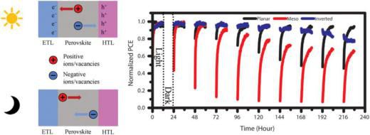 本文通过连续12小时昼/夜循环测试系统地研究了具有各种结构钙钛矿太阳能电池(PSCs)(平面、介观和反式)的降解机制,建立了PSC老化不稳定性与器件物理之间的关系。通过对日/夜循环测试分析得出PSC昼/夜循环测试中的老化行为可以通过循环离子迁移机制证实,其中在光照下离子向电极界面移动并在黑暗中移回本体。这种循环离子迁移在块状钙钛矿中会产生缺陷而不破坏晶体结构。