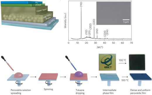 本文报道了基于溶液加工介观和平面结构钙钛矿太阳能电池的关键工艺,使用CH3NH3Pb(I1-xBrx)3(x=0.1-0.15)作为吸光层,PTAA作为空穴传输材料,γ-丁内酯和二甲基亚砜(DMSO)作为混合溶剂,然后进行甲苯滴注形成CH3NH3I-PbI2-DMSO中间相,进而产生极其均匀和致密的钙钛矿层,显着改善了太阳能电池性能,认证的功率转换效率为16.2%,且无回滞现象。