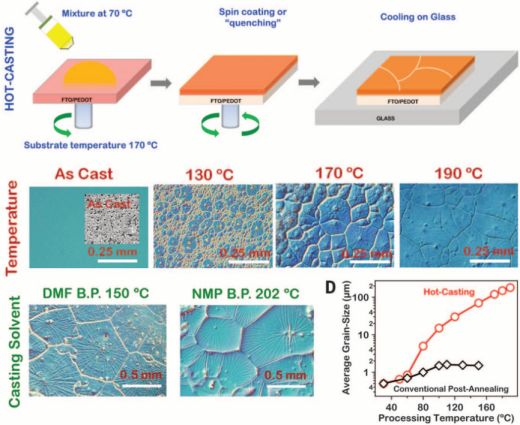 本文展示了一种基于溶液加工的热铸沉积技术,该技术可以生长出致密、无针孔且具有毫米级晶粒的有机金属卤化物钙钛矿薄膜,相应的平面太阳能电池效率接近18%,无迟滞现象,具有较高的重现性。