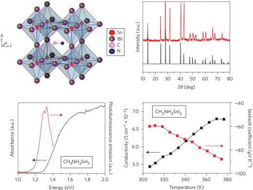 本文报道了基于溶液加工甲基碘化锡(CH3NH3SnI3)钙钛矿半导体作为光捕获剂的非铅钙钛矿光伏器件,CH3NH3SnI3钙钛矿材料具有1.3 eV的光学带隙,并且在950nm处显示仍有吸收,相较于CH3NH3PbI3对应物(1.55eV)存在明显的红移。通过CH3NH3SnI3-xBrx的带隙工程可以可控地调节可见光谱的吸收范围,从而实现无铅钙钛矿太阳能电池的功率转换效率为5.73%。