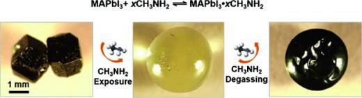 本文报道了一种甲胺(CH3NH2)诱导CH3NH3PbI3钙钛矿薄膜缺陷愈合的发现,钙钛矿薄膜在室温下与CH3NH2气体发生超快的可逆化学反应。这种缺陷愈合行为的关键是在这种神奇的钙钛矿-气体相互作用过程中会形成CH3NH3PbI3-(CH3NH2)x中间液相。这项研究展示了该工艺的多功能性和可扩展性,且能够显著提升钙钛矿太阳能电池(PSC)性能。
